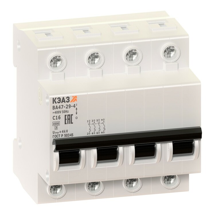 Модульный автоматический 4 полюсный выключатель переменного тока с предельной коммутационной способностью при переменном токе 4.5 кА на номинальный ток 63 А .