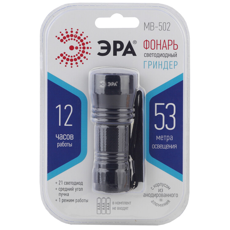 Металлический светодиодный фонарь для ежедневного использования. Это простой и надёжный фонарь, без лишних опций, зато очень практичный и простой. Фонарь обладает компактными размерами, его без проблем можно брать с собой, положить в сумочку или бардачок в машине. Корпус фонаря выполнен из анодированного алюминия, а значит он износостойкий и прочный. Такой корпус защищает фонарь от механических повреждений, а также гарантирует, что при случайном падении фонарь продолжить работать. Для большего комфорта фонарь комплектуется ремешком на запястье. Помимо надёжности и прочности, очевидно, что для фонаря главным качеством является качество света. Фонарь оборудован 21 ярким светодиодом, которые светят ярким белым светом. Такие светодиоды очень надёжны и имеют долгий срок службы. Фонарь выдаёт средний угол пучка, что подходит для большинства бытовых задач. В случае, когда необходим дополнительный источник света, фонарь MB-502 станет отличным инструментом. Он выдаёт мощный луч света на 53 метра освещения. Диоды в фонаре мощностью 1,5Вт. Фонарь работает от трёх батареек ААА и светит без порыва 12 часов.