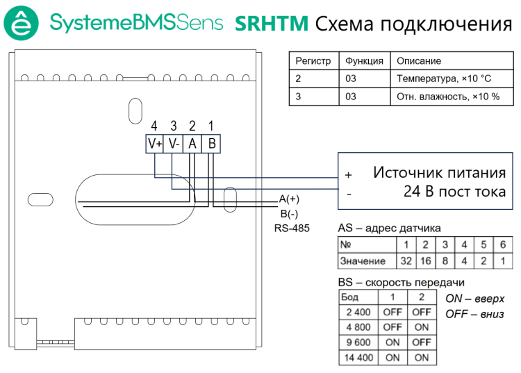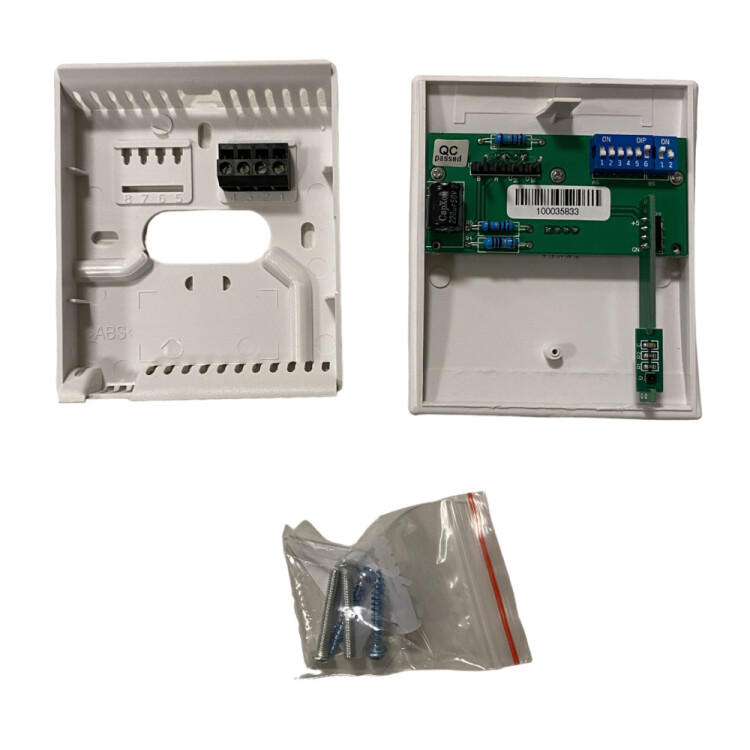Датчик (преобразователь) влажности и температуры комнатный, для контроля параметров воздуха в помещении, диапазон измерения влажности от 0 до 100 %, диапазон измерения температуры от 0 до +50 °С, подключение RS-485, передача показаний по протоколу Modbus RTU, напряжение питания 24 В постоянного тока, накладная настенная установка или установка на подрозетник с расстоянием 60 мм между крепежными отверстиями, степень защиты корпуса IP30, размеры датчика В 100 × Ш 85 × Г 25 мм
