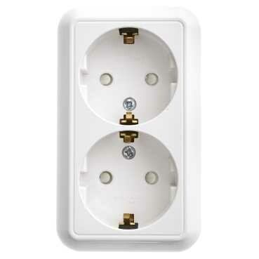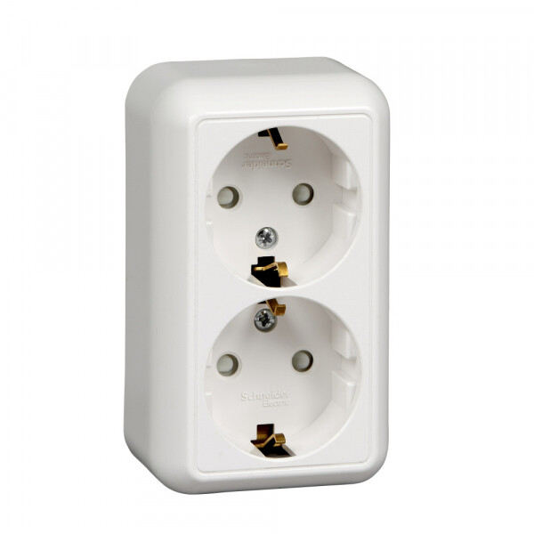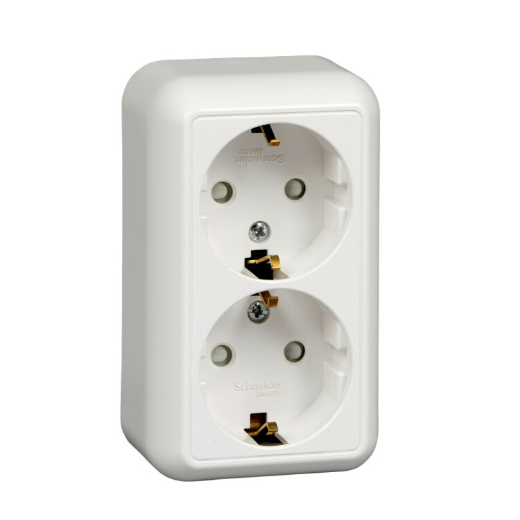 Розетка двойная Schneider Electric ПРИМА (открытой установки, цвет белый) с заземлением и со шторками, с изолирующей пластиковой пластиной предназначена для сетей до 250 В на ток до 16 А.