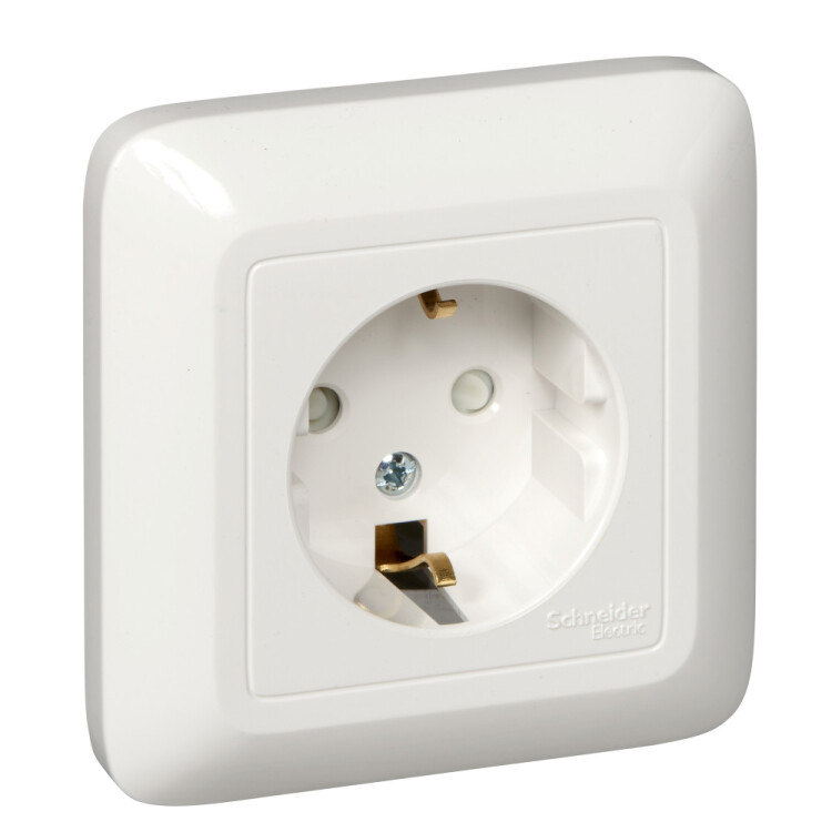 Розетка Schneider Electric ПРИМА (открытой установки, цвет слоновая кость) с заземлением и со шторками предназначена для сетей до 250 В на ток до 16 А.