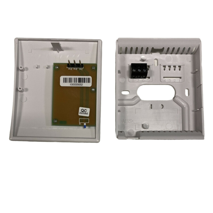 Датчик температуры комнатный, для контроля температуры воздуха в помещении, выходной сигнал PT1000 по 3-проводной схеме, подключение на винтовую клеммную колодку, сечение провода до 1,5 мм², накладная настенная установка или установка на подрозетник с расстоянием 60 мм между крепежными отверстиями, степень защиты корпуса IP30, размеры 85×100×25 мм