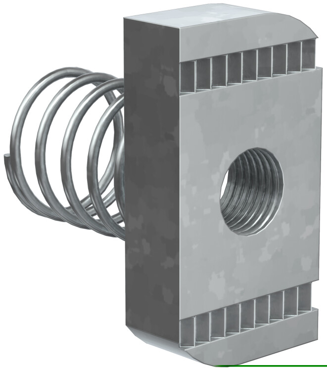 Гайка канальная с пружиной предназначена для крепления элементов STRUT-системы между собой, а также кабельных лотков к STRUT-консолям. Используется с профилем сечения 41х21.