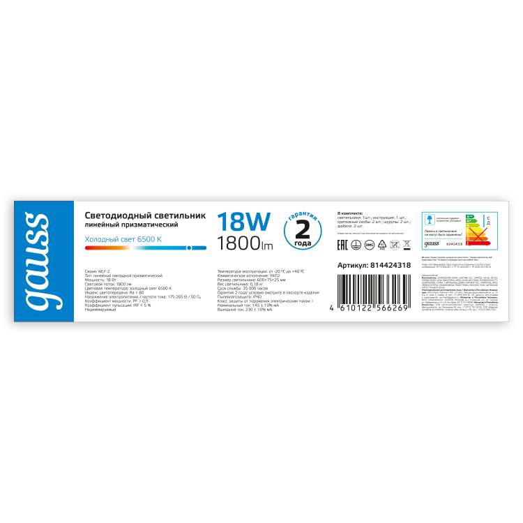 Светильник светодиодный матовый Gauss WLF-2 в стальном корпусе покрытом белой антикоррозийной порошковой краской с опаловым пластиковым рассеивателем. В светильнике использованы сверхяркие светодиоды Sаnan мощность 18w, имеющие при этом световой поток 1560лм с цветовой температурой 6500К. Рабочая температура от -20 до +40 °С и защита IP 40 позволяет отлично применять светильники в основных зданиях - это жилые здания, общественные, коммерческие. Невысокая цена и высокая эффективность ламп позволят экономить средства, затрачиваемые на осветительные приборы.