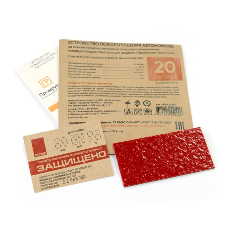 Автономное устройство пожаротушения inSTEG Пластина in Промрукав состоит из термоактивируемых микрокапсул с газовым огнетушащим веществом (ФК-5-1-12), заключенных в газопроницаемую полимерную матрицу, и клеящего слоя для крепления пластин. Малые габариты Пластин позволяют установить их в местах наиболее близких к очагу возможного возгорания (подрозетники, контактные группы, скопление проводов, электрооборудование, щитовое оборудование и пр.), предотвращая возникновение и развитие пожара на ранней стадии в объемах до 65 литров. При пламенном воздействии или нагреве Пластин до температуры срабатывания (+120 °C), микрокапсулы разрушаются и импульсно выделяют газовое огнетушащее вещество, которое сбивает пламя, обрывает кинетические цепи процесса горения, создавая среду, не поддерживающую горение, и моментально прекращает пожар в защищаемом объеме. Противопожарная пластина Промрукав рассчитана на объем до 20 литров и имеет размеры 100х50х2,5 мм.