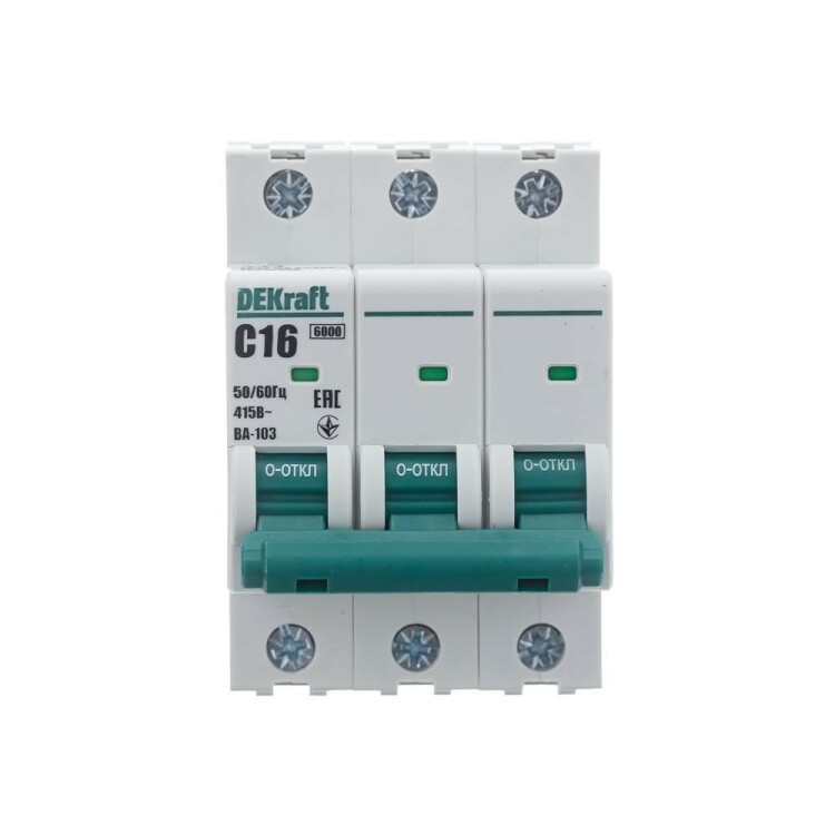 Автоматический выключатель серии ВА-103 NEW DEKraft; 3P; номинальный ток 16 А; характеристика C; отключающая способность 6 кА, что позволяет использовать аппараты в качестве вводных. 5 монолитных заклепок повышают прочность корпуса аппарата. Окошко-индикатор всегда показывает состояние контактов вне зависимости от положения рукоятки управления. Боковые каналы охлаждения повышают стабильность работы при высоких температурах окружающей среды. Есть возможность установки дополнительных аксессуаров с левой стороны устройства. Аппарат на 100% совместим с корпусами и оболочками DEKraft, Systeme Electric.