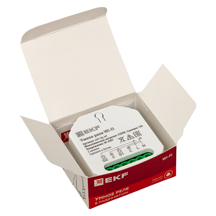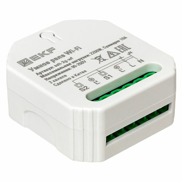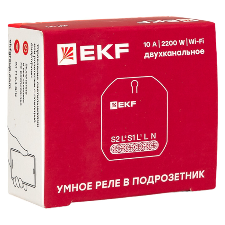 Умное реле в подрозетник 2-канальное Wi-Fi EKF Connect предназначено для управления световыми приборами или розетками с помощью смартфона. Имеет функции: • удаленное включение/отключение электроприборов из любой точки планеты при наличии подключения к Интернету; • отключение по таймеру обратного отсчета; • включение/отключение по расписанию; • управление голосом с помощью голосового помощника Алисы от компании Яндекс. Управление умным реле осуществляется с помощью мобильного приложения EKF Connect Home для iOS и Android.