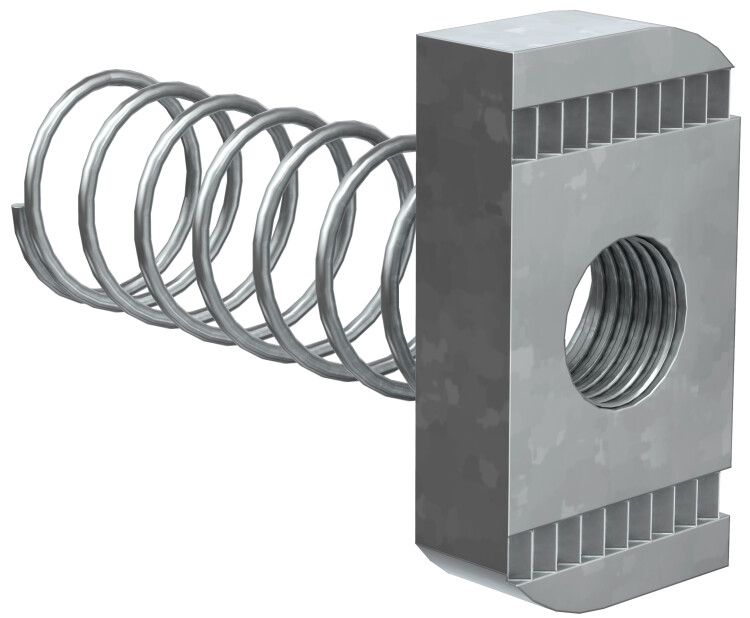 Гайка канальная с удлиненной пружиной предназначена для крепления элементов STRUT-системы между собой, а также кабельных лотков к STRUT-консолям.