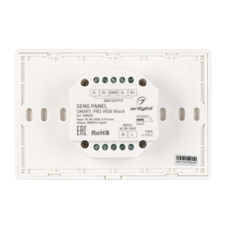 Встраиваемая сенсорная панель 2.4 ГГц, цвет чёрный. Итальянский стандарт. Материал - стекло. Для управления RGB источниками света (ШИМ), 4 зоны управления. Функция управления DMX512 устройствами. Питание/рабочее напряжение AC 85-265V. Габариты 120х80х37 мм, устанавливается в стандартный подрозетник. Панель совместима с диммерами серии SMART.