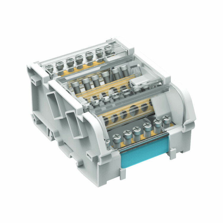 Предназначен для структурированного подключения отводных линий, разведения входящего проводника на несколько потребителей или участков. Позволяет создать упорядоченные системы распределения в электрощитах. Корпус блока выполнен из не поддерживающего горение полиамида PA6.6 и 4-х токоведущих шин в блоках 100 А, представляющие собой бруски из латуни с 7-ю отверстиями, в которые вставляются провода и зажимаются винтом. Избежать случайного прикосновения к токоведущим частям позволяет защитный экран на корпусе блока. Наличие задней крышки для предотвращения контакта с DIN-рейкой или металлической поверхностью сзади.
