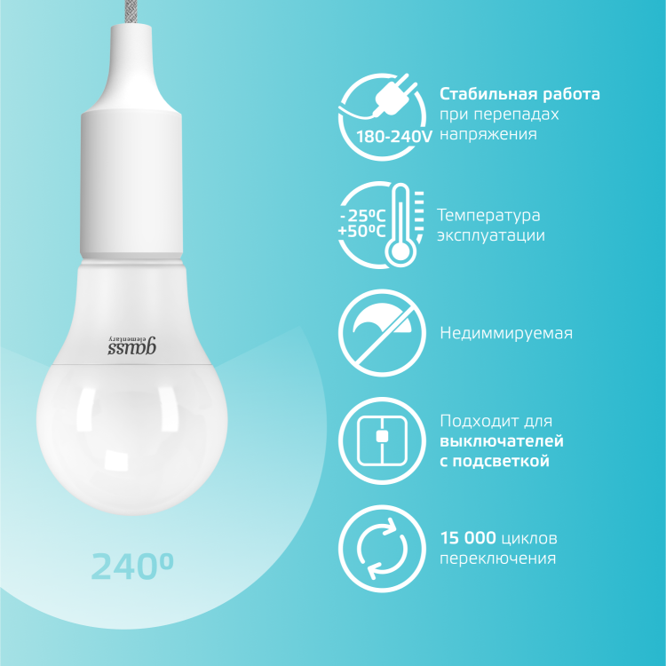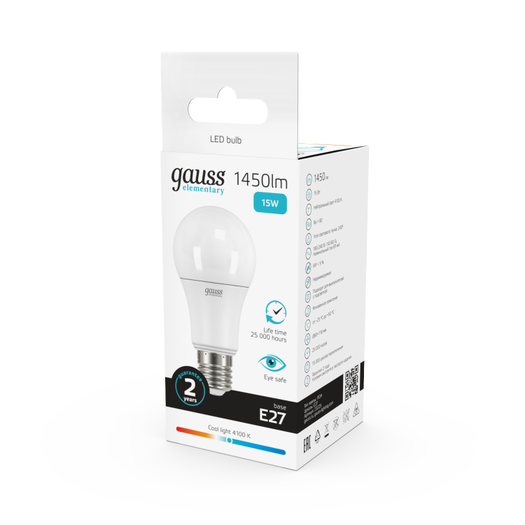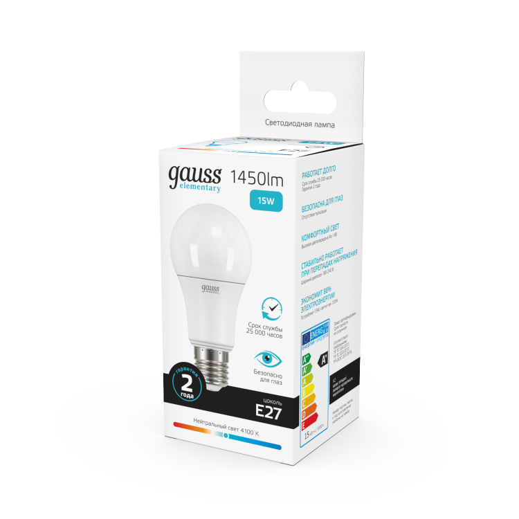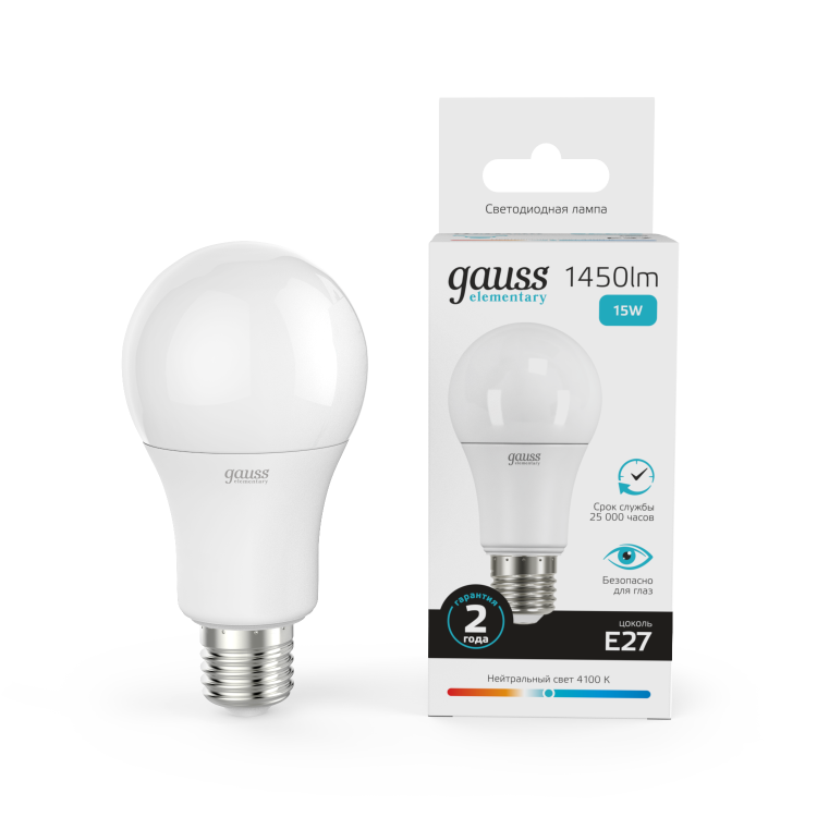 Лампа Gauss Elementary A60 сочетает всегда уместные энергоэффективность и функциональность с лаконичной формой. Светового потока лампы вполне достаточно для яркого, равномерного освещения в большинстве помещений. Благодаря светодиодной технологии, она потребляет всего 15 ватт энергии, что позволяет значительно сократить как затраты энергии, так и ваши расходы на её оплату. Цветовая температура 4100K наполнит помещение освежающим дневным светом. Это может быть иногда уместно даже в спальне, но лучше подойдет для гостиной или другого помещения, где вы хотите создать умеренно расслабляющую атмосферу.