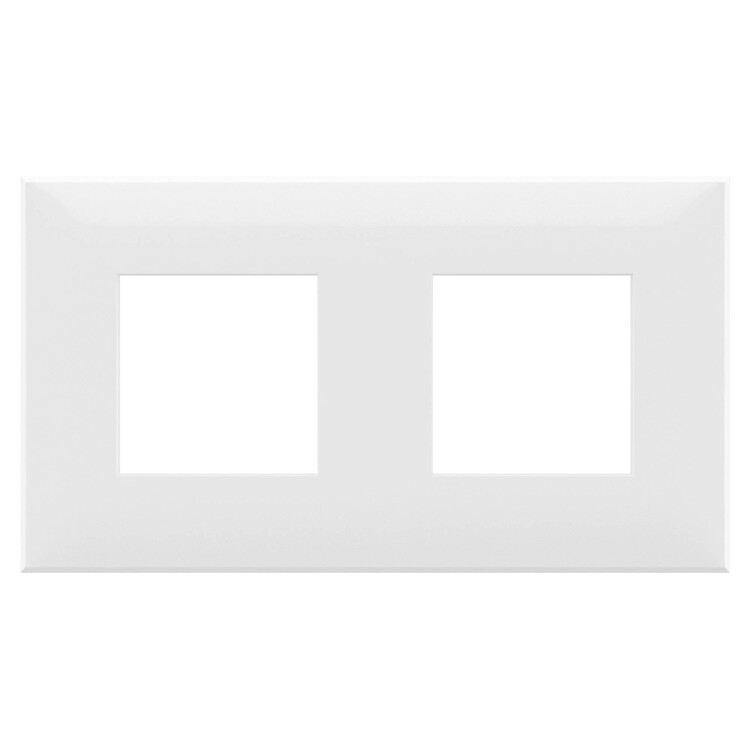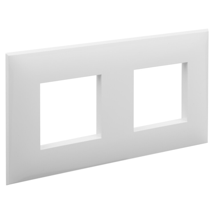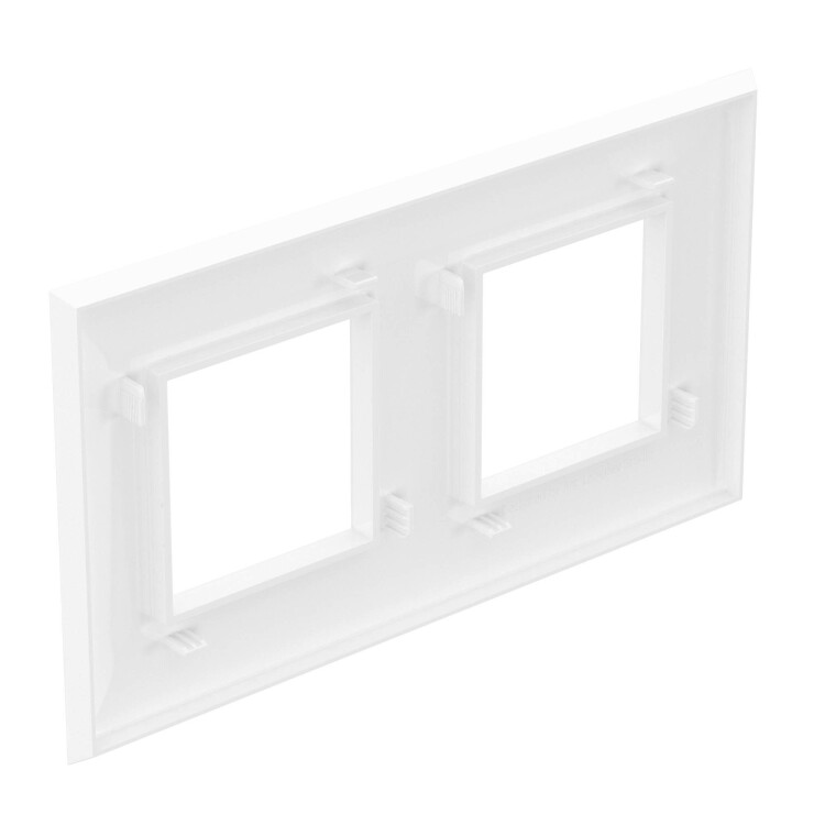 Рамка имеет 2 места под электроустановочные изделия (максимальная вместимость – 4 модуля), может размещаться как горизонтально, так и вертикально. Габаритные размеры: 160х90 мм. Материал – термопласт.