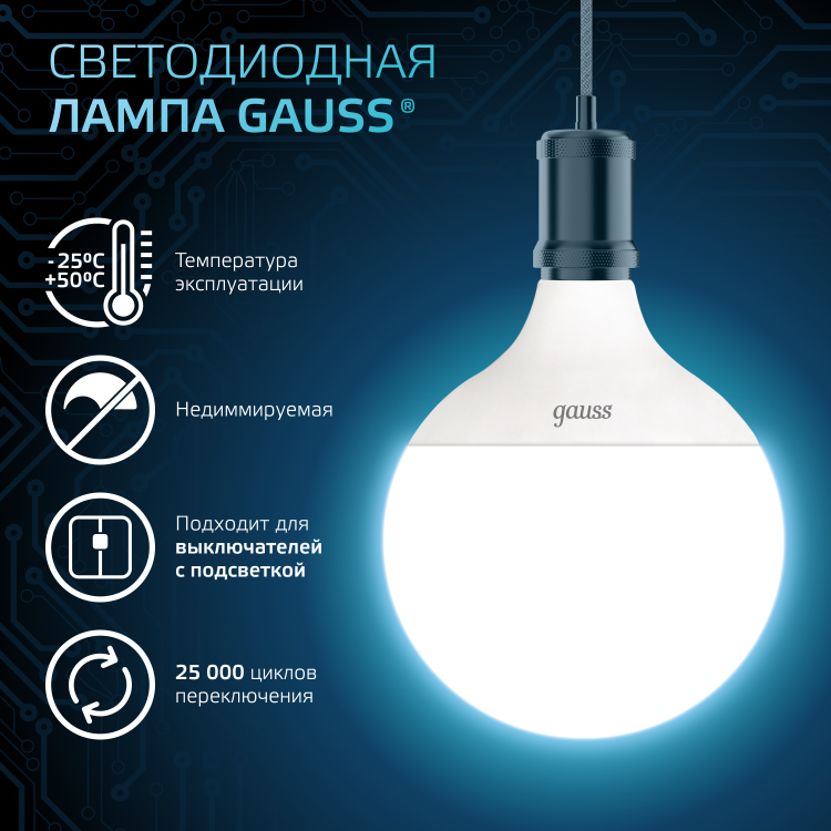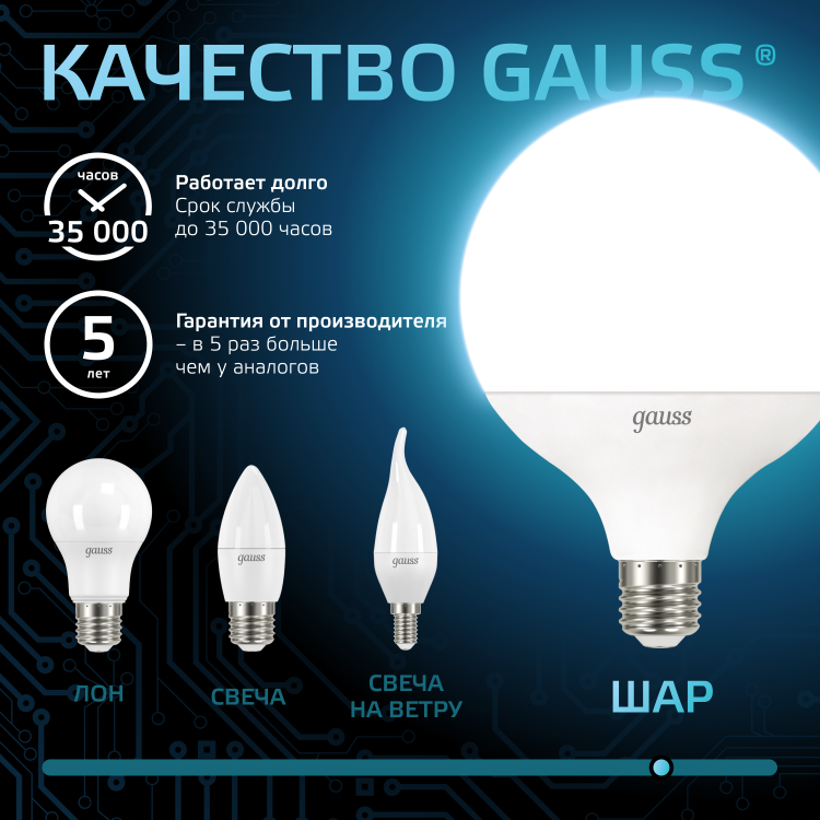 Премиальная серия ламп Gauss Black — надежные источники освещения высокого качества. Благодаря использованию качественных комплектующих и современных технологий лампы этой серии имеют один из самых высоких показателей энергоэффективности и долговечности. Уровень пульсации светового потока в светодиодных лампах Gauss ниже 5%, поэтому они создают комфортный и безопасный свет. Покупатель ламп серии black может быть уверен, что получает безопасный для глаз, яркий и комфортный свет. Передовые технологические решения обеспечивают стабильный световой поток даже при перепадах напряжения. Длительный срок гарантии — решение, основанное на уверенности в качестве продукции и ее долговечности.