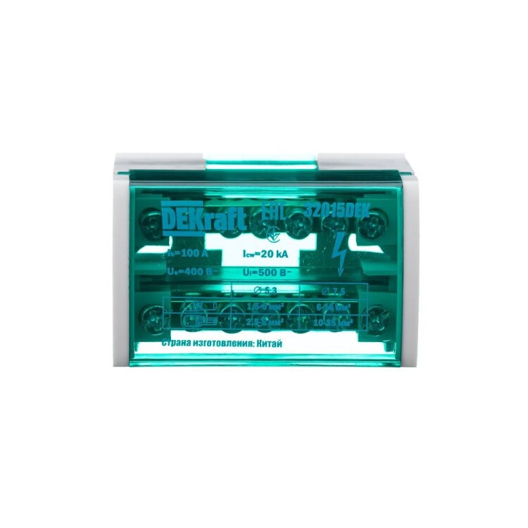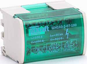 Кросс-модуль серии ШН-103 Dekraft; номинальный ток - 100 А; исполнение – 2 ряда по 7 отверстий (5х5,3 + 2x7,5); материал корпуса – нагревостойкий пластик; материал шин – высококачественная электротехническая бронза; каждая шина отдельно изолирована; цвет крышки – зеленый; установка – на DIN-рейку 35 мм или на монтажную панель двумя винтами M4; степень защиты - IP20. Применение кросс-модулей в щите обеспечивает компактную разводку кабелей и защиту от прикосновения к токоведущим частям.
