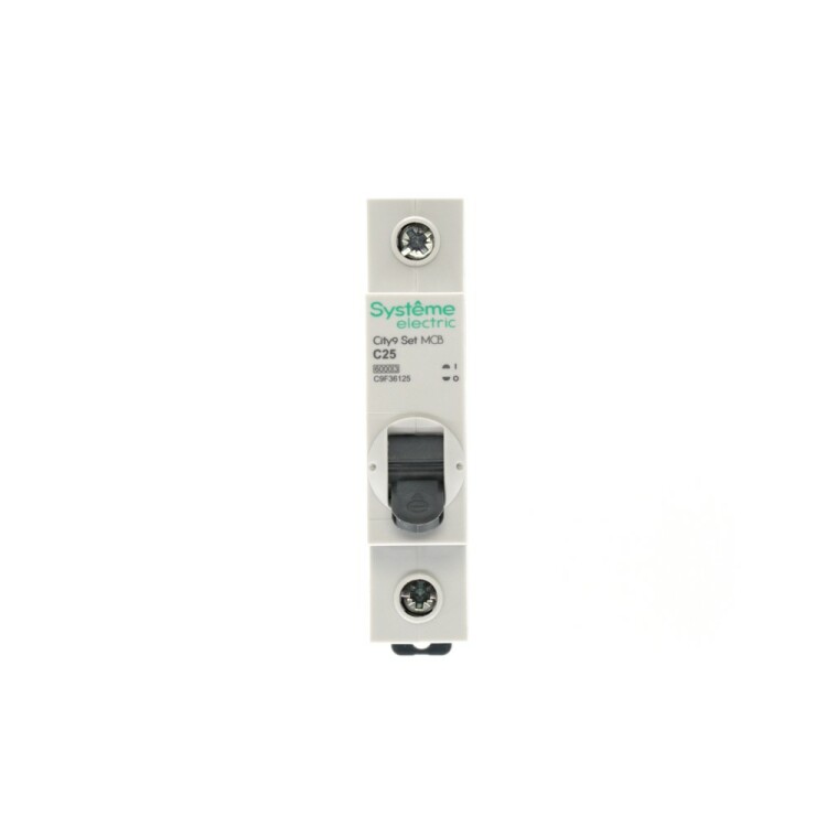 Автоматический выключатель серии City9 Set Systeme Electric, 1-полюсный, номинальный ток 25 А, характеристика С, Icn = 6 кА. Применяется в электрических сетях напряжением 230 В. Предназначен для защиты от перегрузок и токов короткого замыкания. Оснащен механизмом «мгновенной коммутации». Ударопрочный корпус из специального пластика с 6 металлическими заклепками. Безопасные клеммы исключают попадание кабелей в заклеммное пространство.