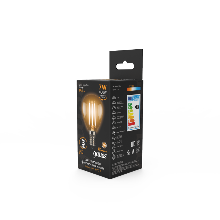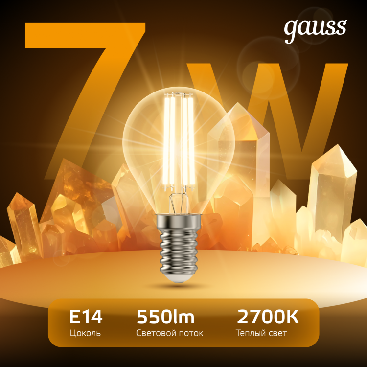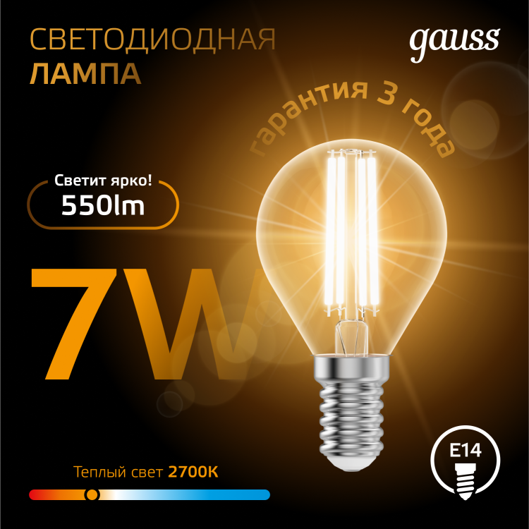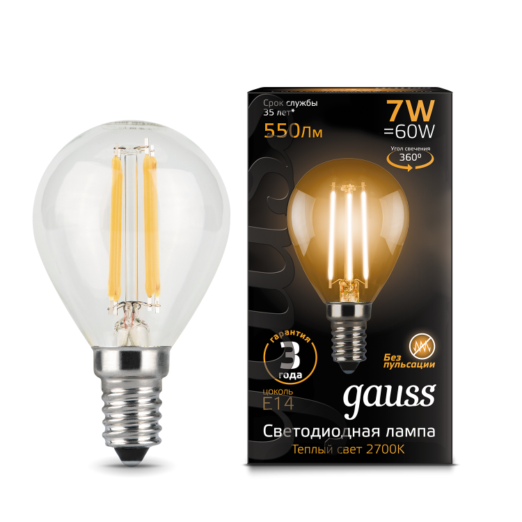 Светодиодные филаментные лампы GAUSS - это новейшие технологии в светотехнике. Лампы имеют привычный вид классических ламп накаливания, освещают пространство на 360о и дают больше света по сравнению с обычными светодиодными лампами за счет прозрачной колбы. Идеально подходят для хрустальных люстр и открытых светильников, а также для реализации дизайнерских решений, где важен вид классических ламп накаливания.