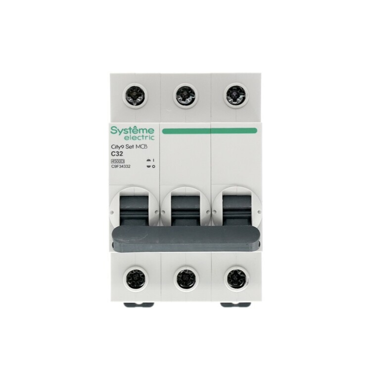 Автоматический выключатель серии City9 Set Systeme Electric, 3-полюсный, номинальный ток 32 А, характеристика С, Icn = 4.5 кА. Применяется в электрических сетях напряжением 400 В. Предназначен для защиты от перегрузок и токов короткого замыкания. Оснащен механизмом «мгновенной коммутации». Ударопрочный корпус из специального пластика с 6 металлическими заклепками. Безопасные клеммы исключают попадание кабелей в заклеммное пространство (ранее Schneider Electric Easy9 EZ9F34332).