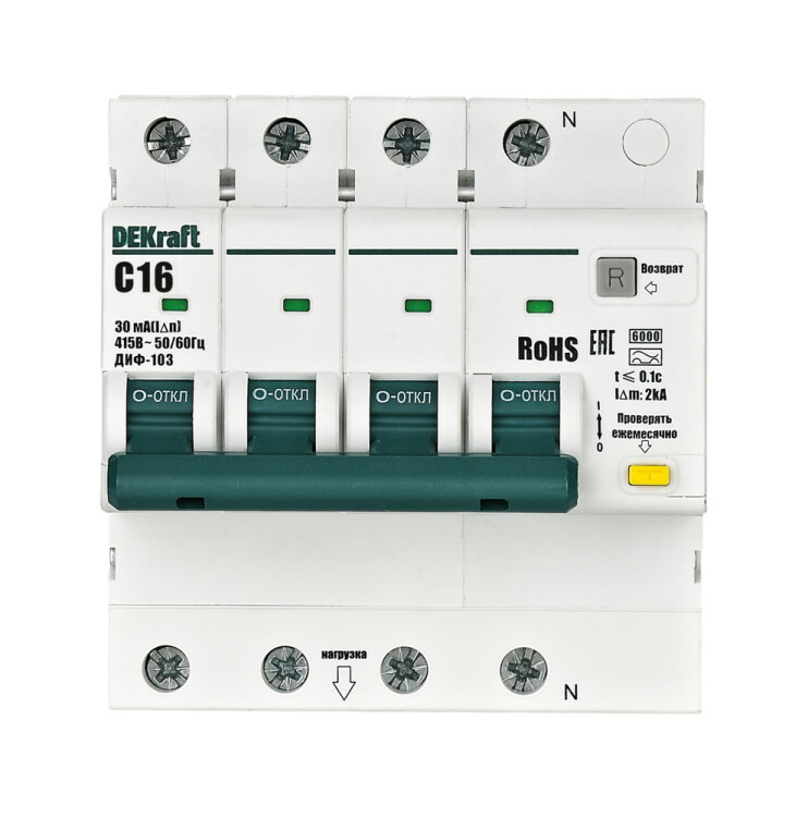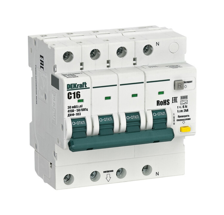 Автоматические выключатели дифференциального тока серии ДИФ-103 6кА NEW Dekraft; 3P+N; номинальный ток 16 А; ном. диф. ток 30 мА; тип диф. расцепителя - A; кривая отключения - С; Icn, Ics = 6 кА; тип устройства - электронный; монтаж – на DIN-рейку. АВДТ обеспечивают три вида защиты - от короткого замыкания, перегрузки и возникновения утечки тока (в частности, вследствие прикосновения человека к токоведущим частям).
