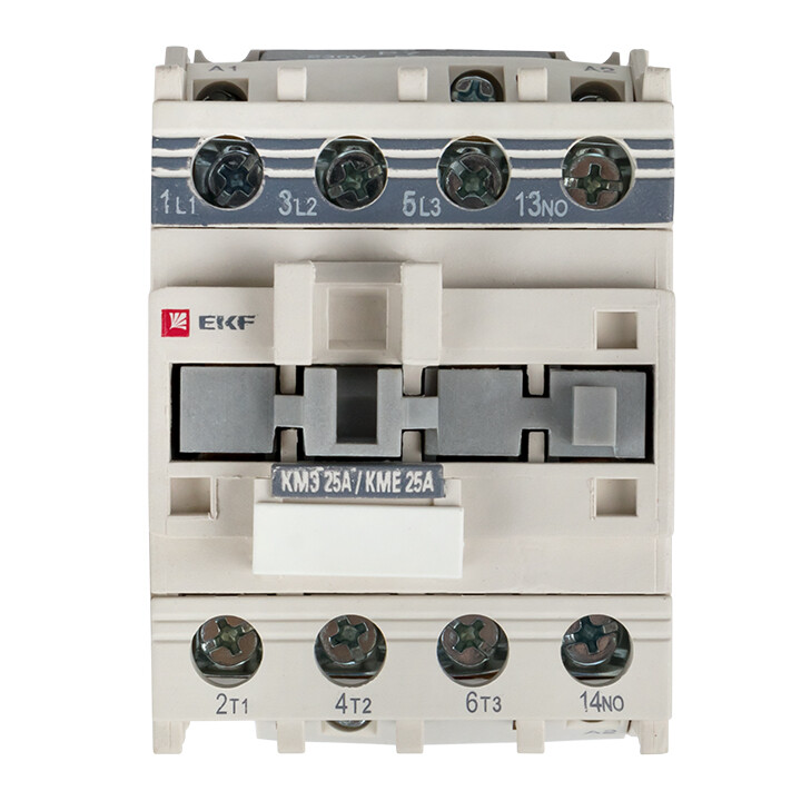 Контакторы КМЭ EKF PROxima состоят из корпуса, закрепленных в нем неподвижных контактов, подвижных контактов, которые закреплены в подвижной части магнитной системы. Неподвижная часть магнитной системы закреплена жестко в корпусе КМЭ. Пружина препятствует смыканию контактов. При подаче напряжения на катушку управления в магнитной системе контактора возникает магнитное поле, которое, преодолевая сопротивление пружины, смыкает магнитную систему и замыкает контакты. При отключении напряжения с катушки управления пружина размыкает контакты. Возможна коммутация алюминиевым и медным проводом. Основное назначение контактора КМЭ – частые дистанционные включения и выключения силовых электрических цепей в нормальном режиме работы.
