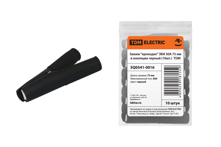 TDM Зажим "крокодил" ЗКИ 30А 75мм в изоляции черный (10шт)
