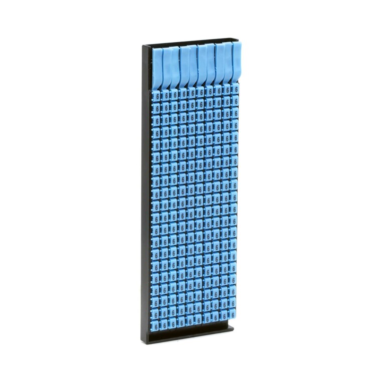 Ручная маркировка системы «Марк» (Mark) 3 для маркировки проводов без разъединения электрической цепи из полиамида 6.6. Температура эксплуатации от –40 до +100 °С. Боковые штифты надёжно фиксируют соединение друг с другом и позволяют добиться точного выравнивания маркеров. Цвет маркеров соответствует международной кодировке. Символ «6» черным цветом на голубом маркере для сечения провода 1.5-2.5 мм². 200 маркеров в упаковке.