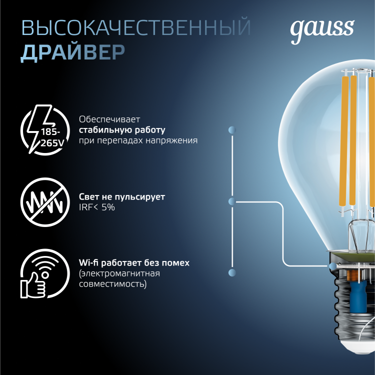 Светодиодные филаментные лампы GAUSS - это новейшие технологии в светотехнике. Лампы имеют привычный вид классических ламп накаливания, освещают пространство на 360о и дают больше света по сравнению с обычными светодиодными лампами за счет прозрачной колбы. Идеально подходят для хрустальных люстр и открытых светильников, а также для реализации дизайнерских решений, где важен вид классических ламп накаливания.