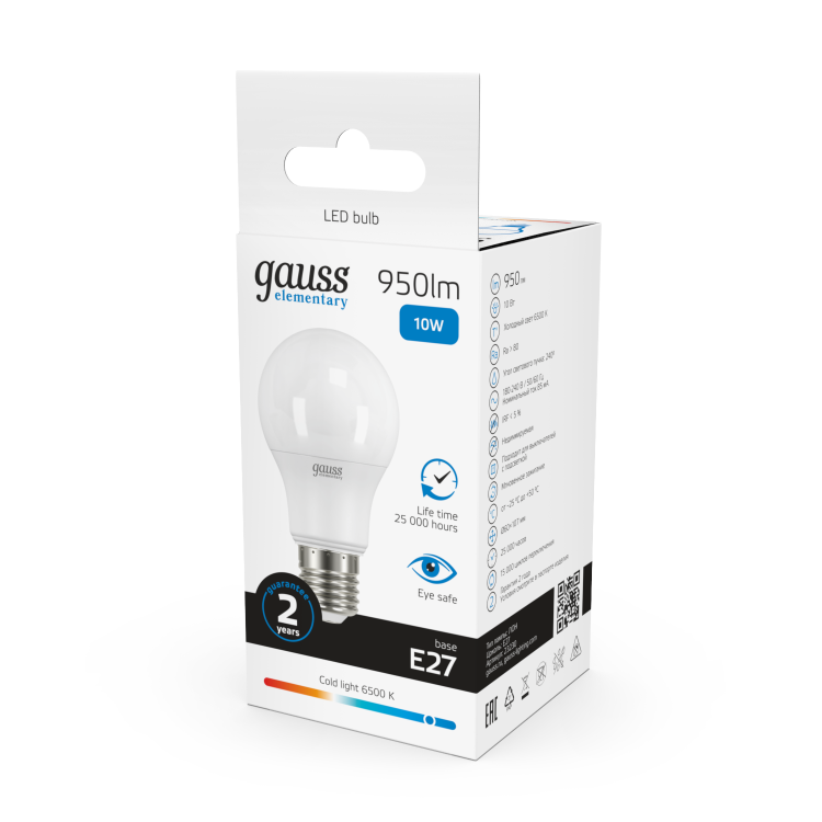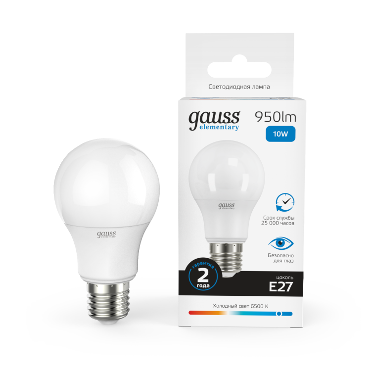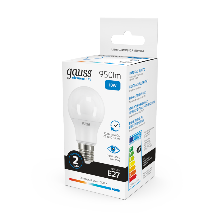 Лампа Gauss Elementary A60 при скромном потреблении в 10 Вт обладает солидной силой светового потока, который проникнет в каждый уголок помещения, создавая равномерное освещение с достаточной яркостью и чистотой света. Цветовая температура 6500К добавит ощущение свежести и энергии всему пространству. Эффективно экономит электроэнергию, что поможет снизить ваши счета за электричество и сберечь окружающую среду. Наслаждайтесь её безукоризненной работой на протяжении всего внушительного срока службы. Порадуйте себя современными энергоэффективными решениями доверившись Gauss.