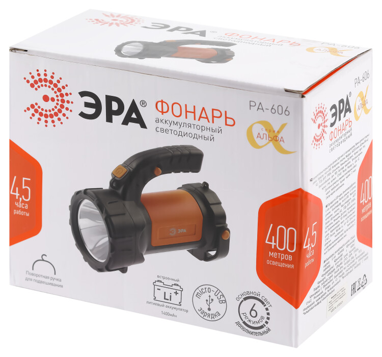 PA-606 светодиодный аккумуляторный фонарь ЭРА серии Альфа. Легкий и очень яркий. Заряжается при помощи поставляемого в комплекте microUSB-кабеля. Емкий литиевый аккумулятор (1400 мАч) держит заряд 4,5 часа при непрерывной работе. Обеспечивает до 400 метров освещения. Основной свет дополняют несколько режимов с разной яркостью и миганием.Переносной прожектор ЭРА Альфа PA-606 имеет удобную ручку с прорезиненной кнопкой включения под пальцем, а также поворотный держатель для подвешивания. Вы можете использовать эту модель как мощный фонарь дальнего света или светильник с мягким рассеиванием светового потока.