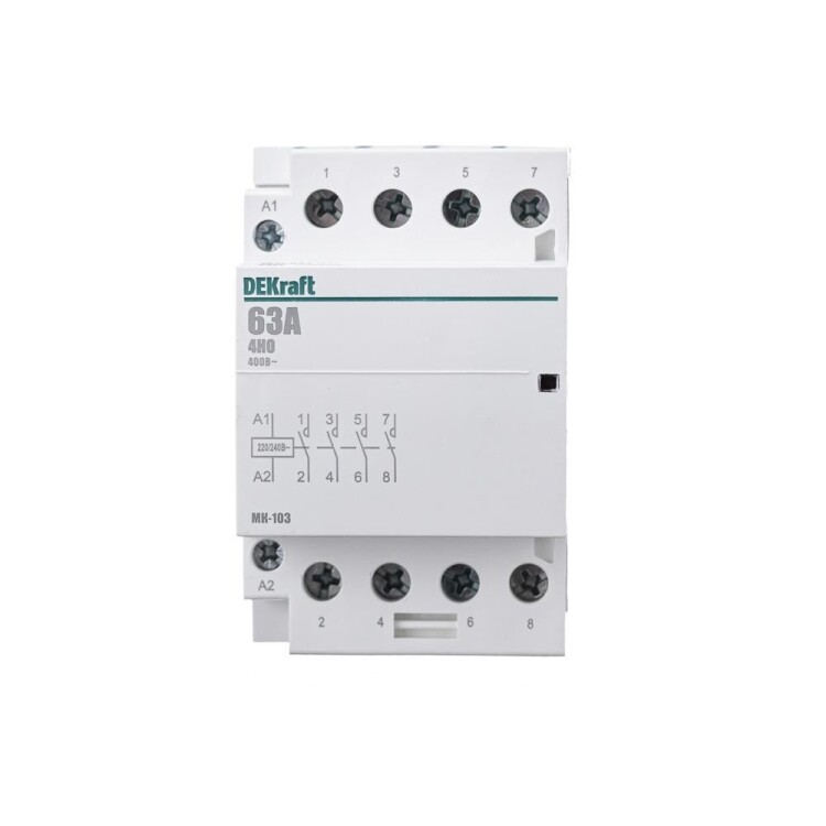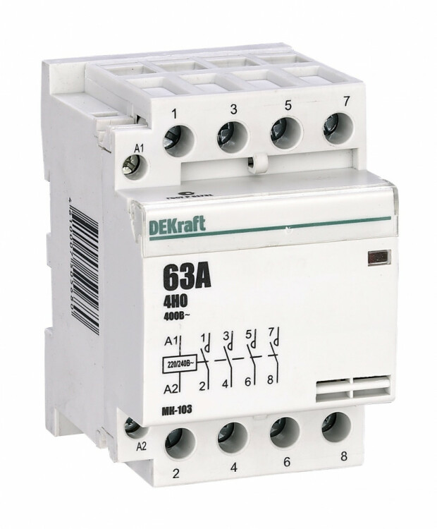 Модульный контактор серии МК-103 Dekraft; н ом.ток 63 А (АС-7а); кол-во и исполнение контактов – 4НО; напряжение управления 220 В пер.тока; ширина – 3 мод. х 18 мм; установка – на DIN-рейку. Контакторы МК-103 применяются в сетях напряжением до 400 В пер.тока для дистанционного управления небольшими нагрузками, требующими большого количества включений / отключений, например, насосы, системы вентиляции и т.п. Модульные контакторы не требуют дополнительных настроек и специального обслуживания.