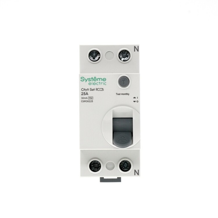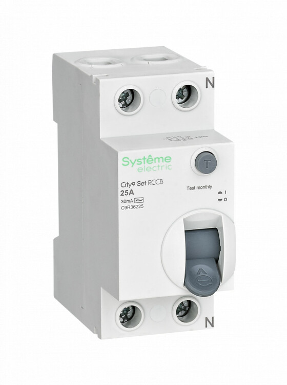 Выключатель дифференциального тока (ВДТ) и ли устройство защитного отключения (УЗО) серии City9 Set Systeme Electric, 2-полюсный, номинальный ток 25А, ток утечки 30 мА, тип АС, электромеханический. Применяется в электрических сетях напряжением 230В. Уставка по току утечки 30 мА обеспечивает гарантированную защиту людей при прямом и косвенном прикосновении. Кнопка тест обеспечивает проверку работоспособности аппарата. Крепление на DIN-рейку шириной 35 мм. Подключение сверху и снизу. Безопасные клеммы (ранее Schneider Electric EZ9R34225).