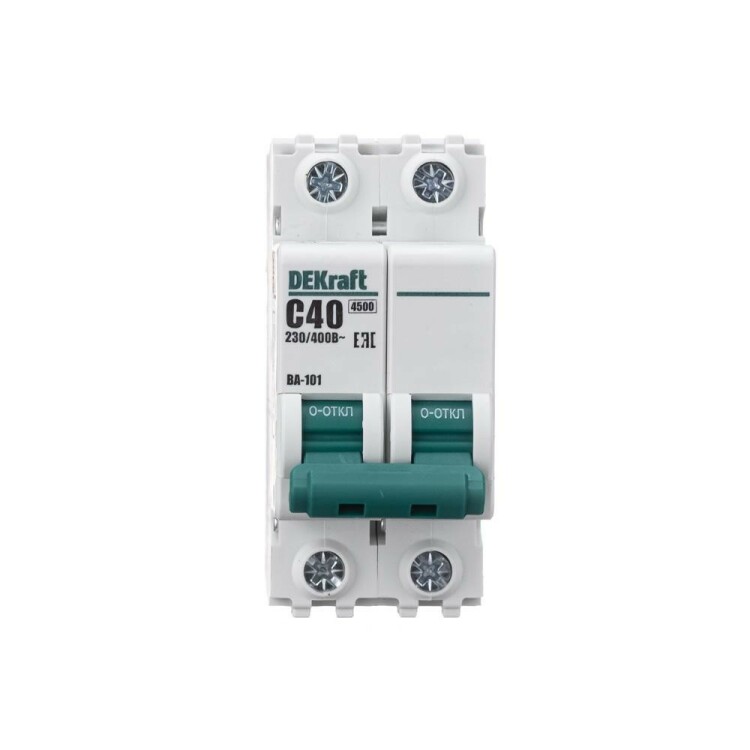 Автоматический выключатель серии ВА-101 Dekraft; 2P; номинальный ток 40 А; характеристика С; отключающая способность 4,5 кА. 5 монолитных заклепок повышают прочность корпуса аппарата. Сплошная лицевая панель обеспечивает безопасность эксплуатации аппарата. Боковые каналы охлаждения повышают стабильность работы при высоких температурах окружающей среды. Есть возможность установки дополнительных аксессуаров с левой стороны устройства. Аппарат на 100% совместим с корпусами Dekraft и Systeme Electric.