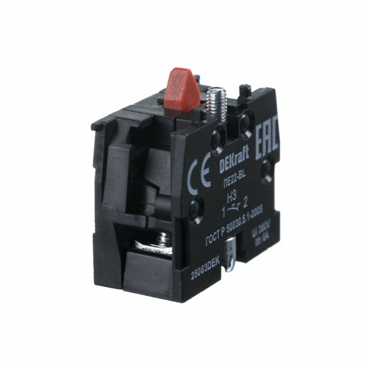 Контакт дополнительный серии ДК-22 Dekraft; предназначен для двойных кнопочных выключателей серий ПЕ-22; исполнение – 1НО; цвет – зеленый. Контакт устанавливается на управляющий элемент с правой или с левой стороны.