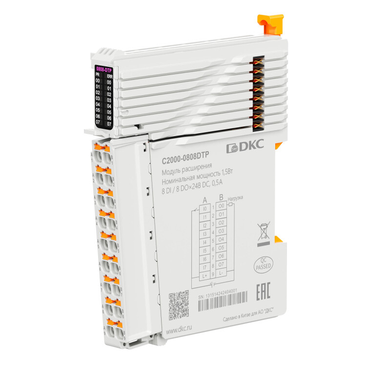 Модуль расширения ДКС C2000-0808DTP применяется совместно с ПЛК серии C2000 для расширения дискретных I/O в промышленных системах автоматизации: 8 дискретных входов 24В DC (PNP), 8 дискретных выходов 24В DC (PNP). Габариты (ВхШхГ) 15.7 x100 x 80 мм. Рабочая температура -20 ... +55 ºC.