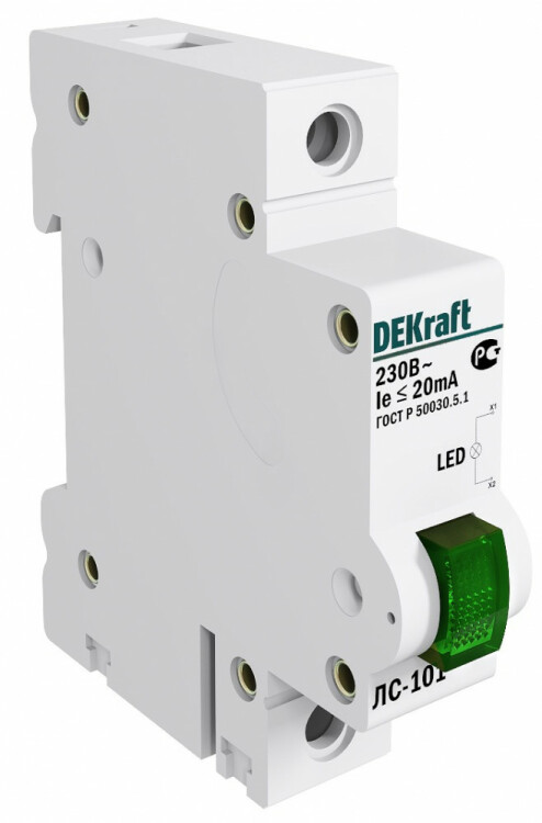 Лампа сигнальная серии ЛС-101 Dekraft; зеленая, с LED-индикацией; потребляемая мощность - 0,5 Вт; ширина – 1 модуль х 18 мм; установка – на DIN-рейку; установочное положение – любое. Лампы предназначены для световой индикации состояния электрической цепи. Лампы применяются в сетях напряжением 220 В. Соответствует дизайну автоматических выключателей серии ВА-101.